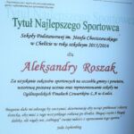 Przygoda Aleksandry Roszak urodzonej 10 . 09 .2004 . rozpoczęła się od pierwszej klasy szkoły podstawowej . Ola reprezentowała szkołę w zawodach na różnych szczeblach , gminnych , powiatowych i wojewódzkich . Zajmowała w rywalizacji w biegach głównie pierwsze miejsca . W tej chwili Ola jest uczennicą VI klasy szkoły podstawowej w Chełście . Wspaniale łączy wyniki sportowe z nauką . Bieganie to jej wielka miłość i pasja , a przecież treningi zabierają jej większość czasu . Do tej pory Ola zdobyła wiele medali i dyplomów .