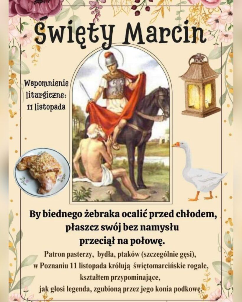 Gęsina na Świętego Marcina to polska tradycja kulinarna związana z 11 listopada, kiedy to jada się dania z gęsi, symbolizujące obfitość i jesienne zbiory, nawiązując do legendy o świętym Marcinie ukrywającym się przed objęciem biskupstwa i zdradzonym przez gęsi. Tradycyjnie pieczoną gęś podaje się z jabłkami, a gęsina jest uznawana za mięso zdrowe i wartościowe .