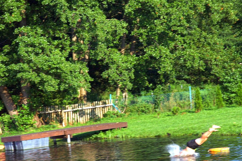 Przypływający tu kajakami na zagospodarowanej działce mogą wypocząć , a także się posilić . Na działce znajduje się duża wiata ze stołem i ławkami , a obok stoi grill . Korzystają z niego wszyscy chętni chcący zakosztować smażonej na nim kiełbasy . Często są to rowerzyści , piesi turyści i podróżujący różnymi środkami lokomocji . Wzdłuż brzegu obok pomostów znajdują się ławki na , który można usiąść i się zrelaksować . Dla chętnych jest również miejsce do gry w piłkę siatkową . Teren działki to miejsce w , którym się najwięcej przebywa . Została zagospodarowana przez Sołectwo , a także Stowrzyszenie . Dzięki temu staje się ona piękniejsza i pełni rolę punktu centralnego Kamiennika . Dodatkowo odbywają się na niej różnorakie spotkania i atrakcje . Obecnie przyjął się zwyczaj , że w ostanim kalendrzowym dniu roku spotykają się tu mieszkańcy i witają nowy rok . Na działce są również inne atrakcje – dzień dziecka ,topienie Marzany w pierwszym dniu wiosny ,witacz dożynkowy , puszczanie wianków na wodę w najkrótsza noc w roku nazywaną świętojańską , a kiedyś Kupały . Pomysłodawcą tych zgromadzeń jest Sołtys Kamiennika pani Bożena Gruszczyńska . Po zakonczeniu turystyki kajakowej